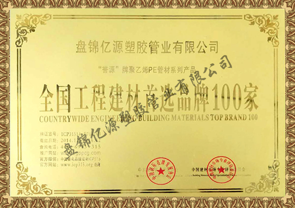 全國工程建材首選品牌100家證書
